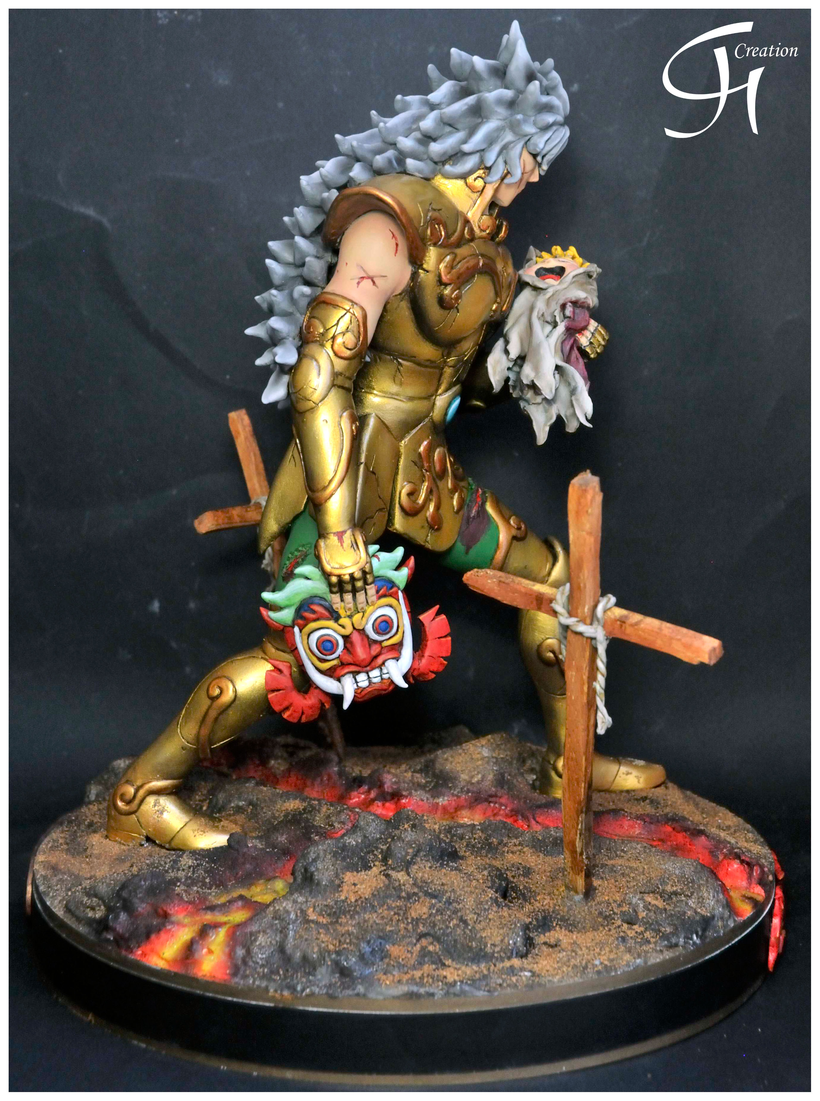 Voici une réalisation très spécifique suite à la demande d'un ami. Cela concerne l'univers Saint Seiya mais la représentation est hors continuité "officielle". La base de cette réalisation est un fan art dont voici le visuel. Il s'agit du maitre d'Ikki, Guilty, qui endosse l'armure du lion et porte Esmeralda dans ses bras. Cela est le retour de la précédente guerre sainte.