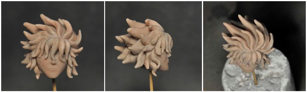 La tête est passé au four à part et ensuite tout est assemblé de manière définitive. Une fois tout en place, je rajoute les reliefs sur les chevilles. J'ai rajouté également des mèches sous le bras.
